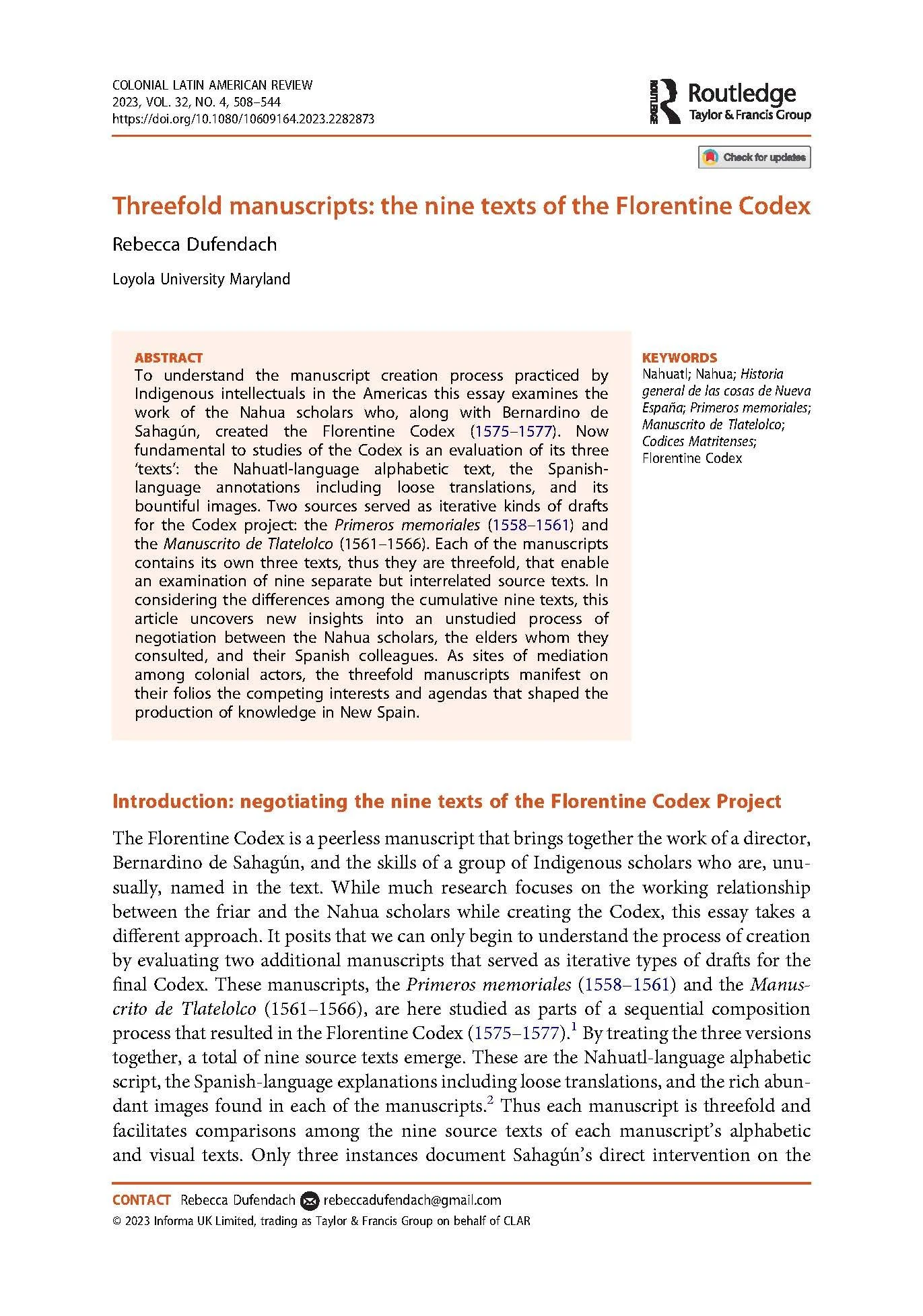 Dufendach, Rebecca. “Threefold Manuscripts: The Nine Texts of the Florentine Codex” (Colonial Latin American Review, vol. 32, Issue 4, 2023) Available here or here. Dufendach, Rebecca, Jeanette Peterson. “Altered Folios, Alternative Histories in the Florentine Codex” (Estudios de Cultura Náhuatl, vol. 64, July-December 2022) or available here. Review of: Jennifer Scheper Hughes. The Church of the Dead: The Epidemic of 1576 and the Birth of Christianity in the Americas. New York: New York University Press, 2021. (Hispanic American Historical Review, vol. 102.3, August 2022) Review of: Lori Boornazian Diel. The Codex Mexicanus: A Guide to Life in Late Sixteenth-Century New Spain. Austin: University of Texas Press, 2018. (Ethnohistory. vol. 68, issue 4, 557-8, 2021) Dufendach, Rebecca. “As if His Heart Died”: A Reinterpretation of Moteuczoma’s Cowardice in the Conquest History of the Florentine Codex.” (Ethnohistory, vol. 66, issue 4, 2019) Editor of Special Issue on Mesoamerican Experiences of Illness or available here. “Tepahtihquetl pan ce pilaltepetzin,/ A Village Healer” by Sabina Cruz de la Cruz, translation from Nahuatl to English by Rebecca Dufendach (Ethnohistory, vol. 66, issue 4, 2019) or available here. Dufendach, Rebecca. “Nahua and Spanish Concepts of Health and Illness in Colonial Mexico, 1519-1615.” Doctoral Dissertation. University of California, Los Angeles. 2017 Dufendach, Rebecca. “Injecting Modernity: Regulating Hygiene in Porfirian Oaxaca, Mexico.” Master’s Thesis. Northeastern University. 2008.